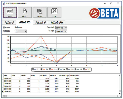 FLUODXConnect Windows database software (FREE) greatly increases the convenience and utility of the Beta FLUO ADVANCED on the production floor, in the QC department, and in the research lab and is included with the Fluo Advanced with purchase.