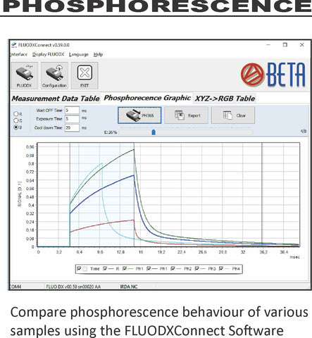 The Beta Fluo ADVANCED greatly extends the measurement, analysis, and display capabilities of the FLUO system. Dual UV LED sources and dynamic emission measurement characterize the relative and absolute intensity and colorimetry of fluorescent materials. Phosphorescent charging and discharge characteristics are measured with millisecond precision, and dual-color materials are analyzed under 256nm and 365nm illumination.